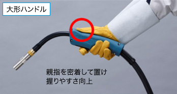 新デザインの「密着性の高いハンドル」「ケーブルの高い柔軟性」であらゆる人にフィットします。 手のひらへの密着性を高めるハンドルデザインです。 トーチケーブルの柔軟性を高め、あらゆる溶接姿勢で負担軽減します。 ハンドルの温度上昇を抑制し、使用率の高い環境でも快適な溶接を実現します。 新たにバイオマス素材を採用し、トーチ製造時のCO2排出量削減します。