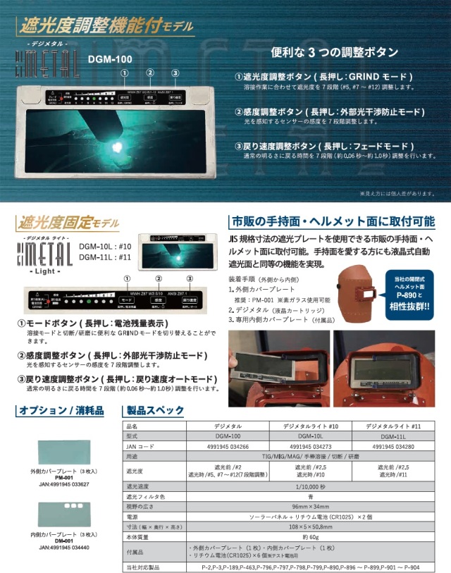 JIS規格寸法の遮光プレートを使用できる市販の手持面・ヘルメット面に取付可能。手持面を愛する方にも液晶式自動遮光面と同等の機能を実現。