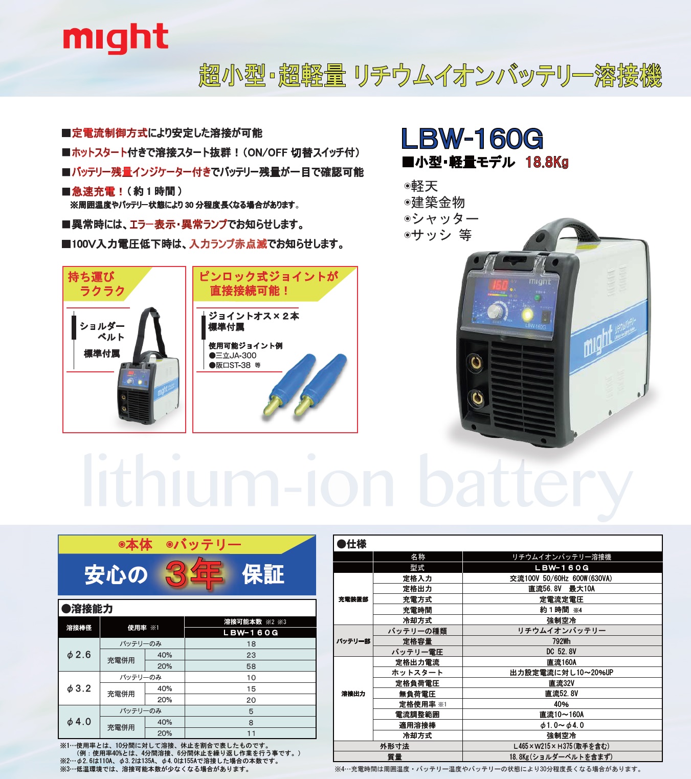| 製品名: | 溶接機 バッテリー溶接機 100V マイト工業 ポータブルバッテリー溶接機 LBW-170G メーカー保証付 アーク溶接機 |