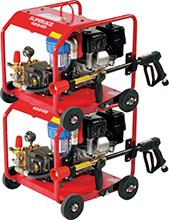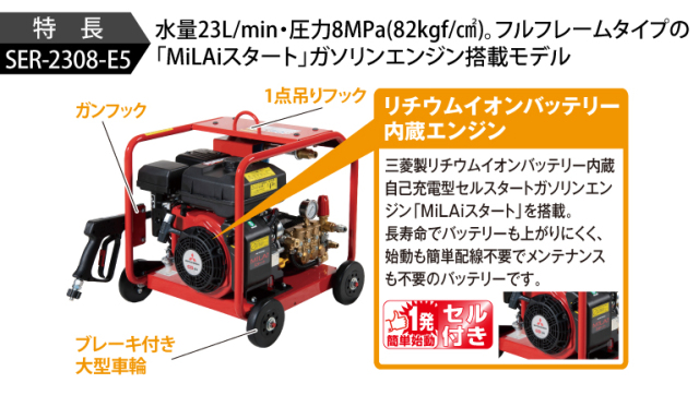 フルフレームタイプの「MiLAiスタート」ガソリンエンジン搭載モデル 吐出水量(L/min):23 吐出圧力(MPa):8 幅(mm):530 奥行(mm):510 高さ(mm):555 エンジン:空冷4サイクル傾斜形OHVガソリンエンジン 給水方式:自吸式 燃料:無鉛レギュラーガソリン 燃料タンク容量(L):3.6 満タン時の最大使用時間:約120分 総排気量(cc):181